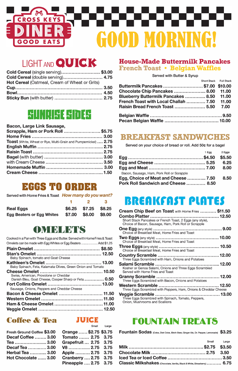 Step inside and you’ll quickly see why the Cross Keys Diner Menu draws both locals and passers-through along 4125 E Swamp Rd in Doylestown. It’s the kind of place where breakfast feels like a warm handshake, thanks to stacks of fluffy pancakes, crisp bacon, and omelets that arrive perfectly packed with fillings. As you move through the options, you’ll notice how easily the classics sit beside heartier comfort foods, making it just as tempting to come back for lunch or dinner.